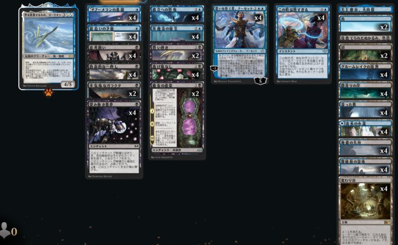 一時期スタンダードを圧巻したディミーアバウンスでしたが、「この町は狭すぎる」「望み無き悪夢」の禁止で無事終了したデッキ。それをパイオニアで戦えるよう調整されたデッキを紹介します。デッキは「空を放浪するもの、ヨーリオン」を相棒にした80枚タイプになります。