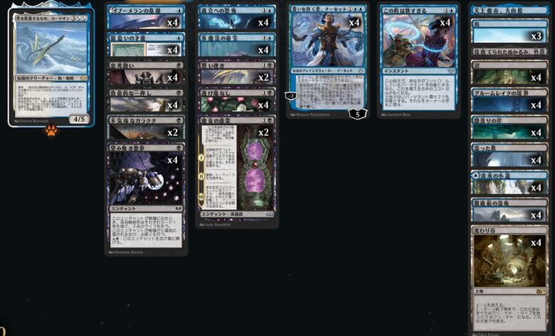 | 相棒(1) 1 《空を放浪するもの、ヨーリオン》 クリーチャー(4) 4 《孤立への恐怖》 プレインズウォーカー(4) 4 《覆いを割く者、ナーセット》 | スペル(42) 4 《思考囲い》 4 《致命的な一押し》 4 《逃げ場なし》 2 《魔女の虚栄》 4 《この町は狭すぎる》 2 《勢い挫き》 2 《不気味なガラクタ》 4 《望み無き悪夢》 4 《嵐追いの才能》 4 《氷魔法の秘宝》 4《ブーメランの基礎》 | 土地(34) 3 《島》 4 《沼》 4 《湿った墓》 4 《清水の小道》 4 《闇滑りの岸》 4 《難破船の湿地》 4 《グルームレイクの境界》 4 《変わり谷》 1 《天上都市、大田原》 1 《見捨てられたぬかるみ、竹沼》 1 《ヨーグモスの墳墓、アーボーグ》 |