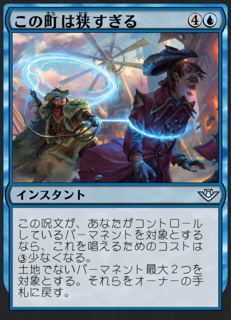 「この町は狭すぎる」はスタンダードで禁止にされるほど強いカードです。本来5マナであるスペルが自分のパーマネントを対象にすれば2マナになります。それだけでなく、1つでも自分のパーマネントを対象にしていれば相手のパーマネントも2マナで戻せるところがさらに強力なんです。