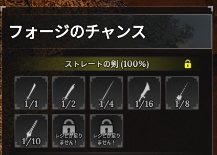 これでストレートの剣のどれかが確定で鍛造できます。鉱石の消費量が増えてやだなぁ、と思うかもしれません。(巨大剣の場合はむしろ作りやすくなってます。)